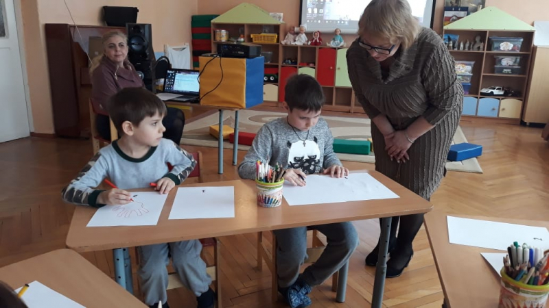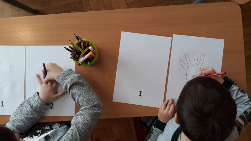 Психолог: Вы –замечательные, хорошо передали настроение музыки. А сейчас попытайтесь нарисовать цвет своего настроения. Я вам предлагаю изобразить на бумаге, как изменилось ваше настроение к концу занятия. Пусть каждый из вас обведёт на листе бумаги 2 раза фломастером свою ладонь. Первый раз фломастером того цвета, каким было ваше настроение вначале, а 2-й раз фломастером того цвета, каким стало ваше настроение к концу занятия. под первой ладонью напишите цифру «1» и раскрасьте ее, а под второй ладонью - цифру «2» Дети работают под музыку.